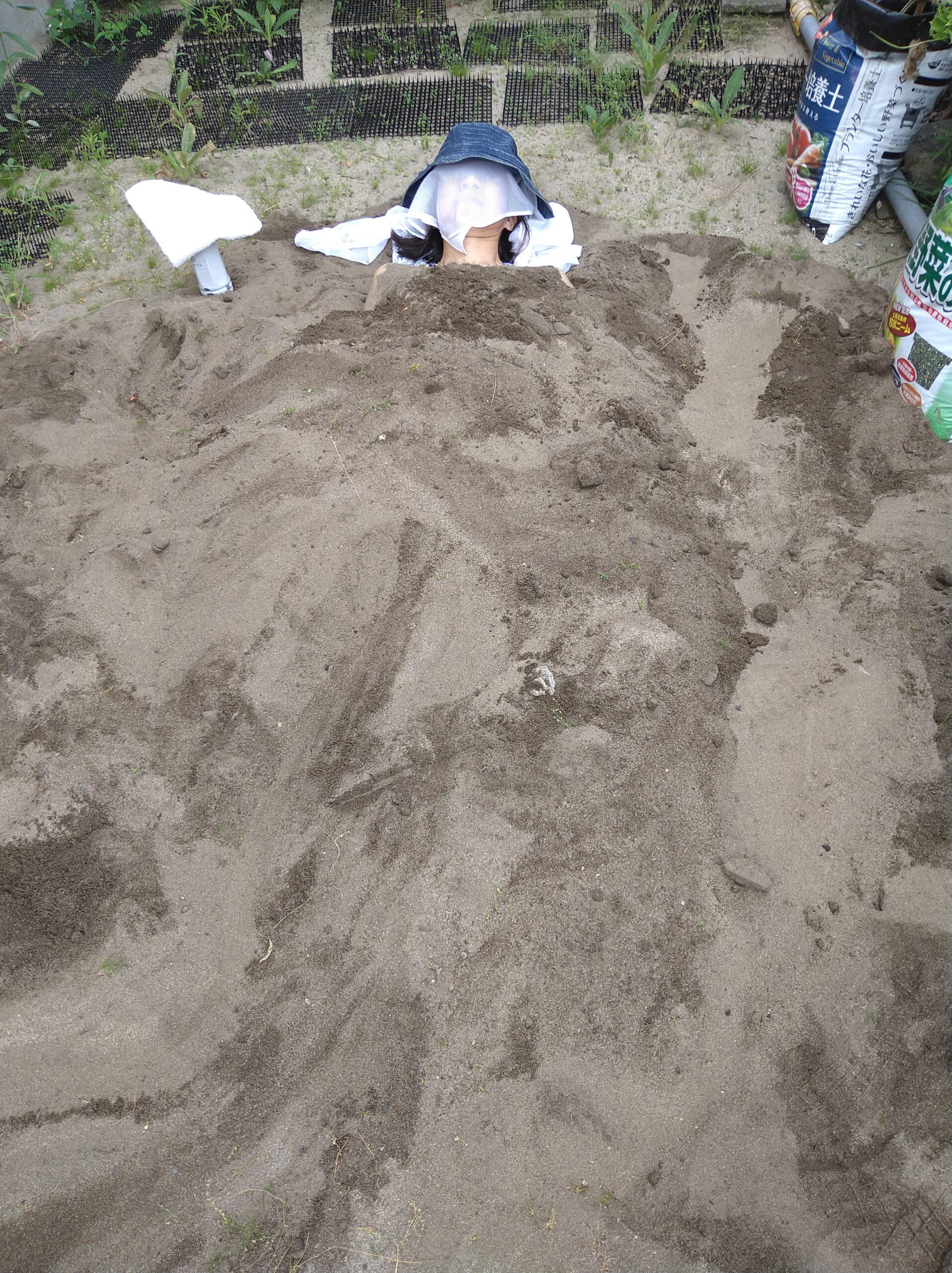 リクライニングチェアに座るような体勢になるように掘って、首だけ出して埋めてもらいます。