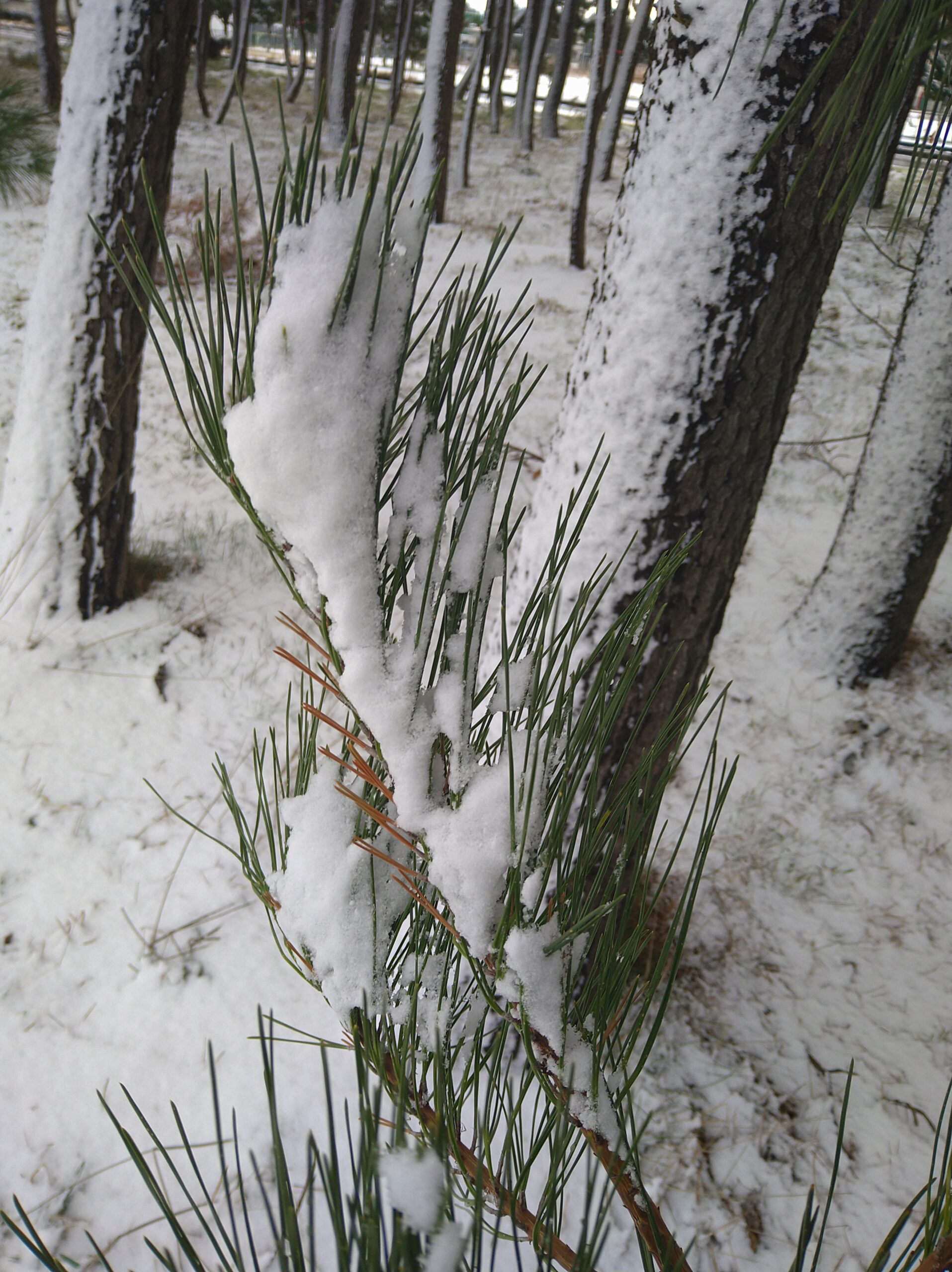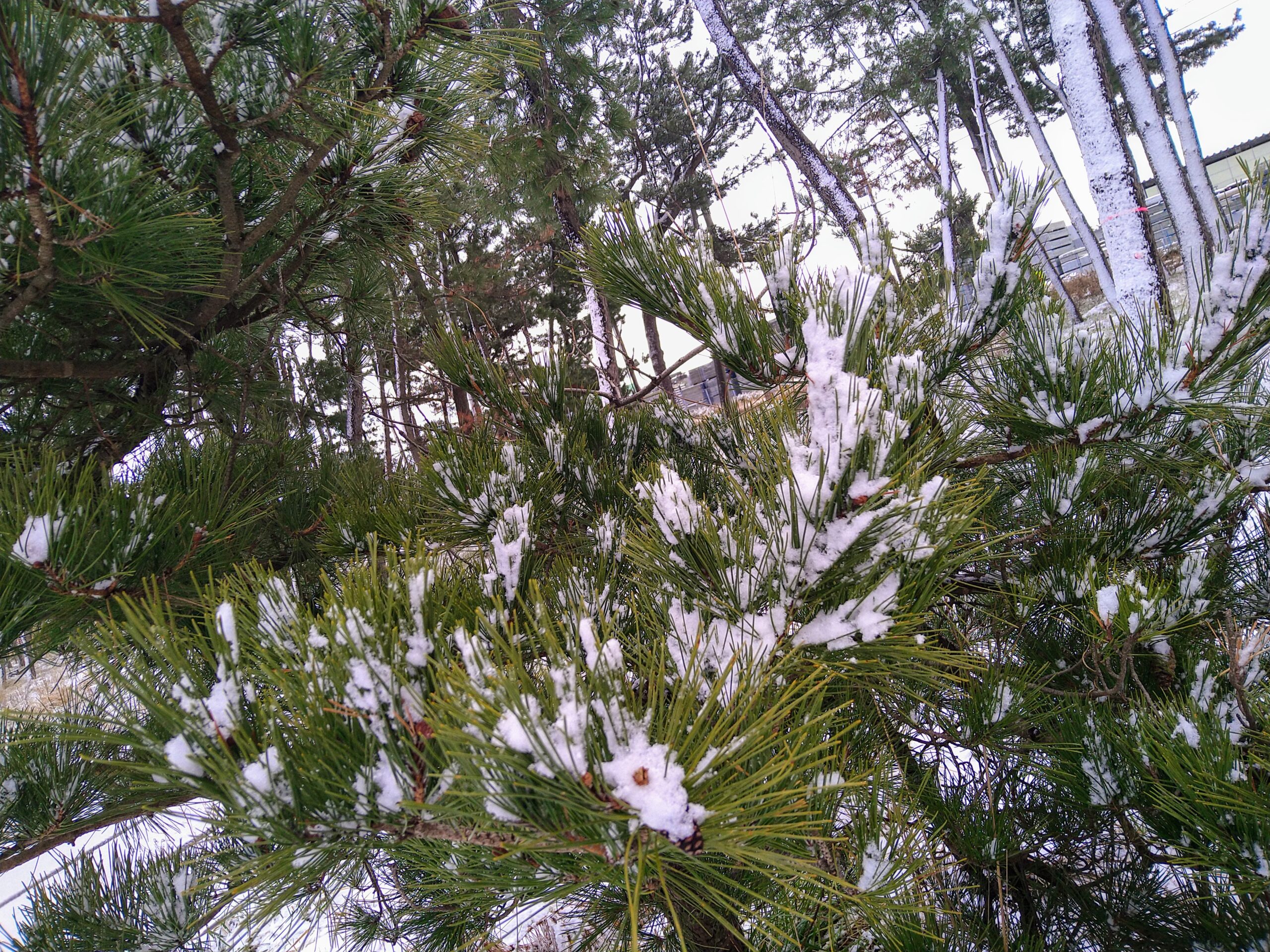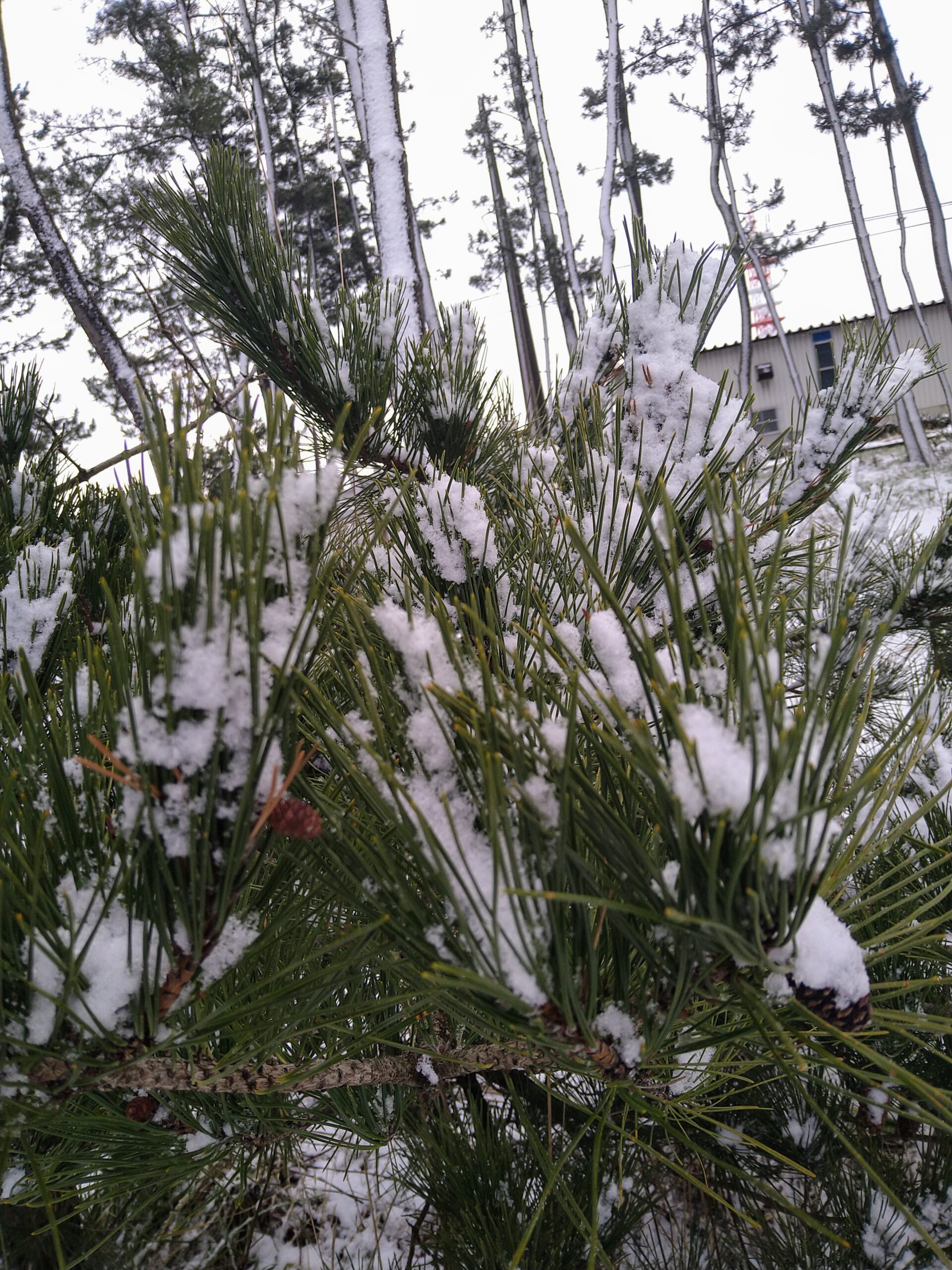 このように雪が降っても、青々とした葉を、枝から落とすことのない黒松。寒いですが、松の香が冷たい風の中に溶け込んでいます。キンと冷えた空氣。その中にも清々しさが漂っています。