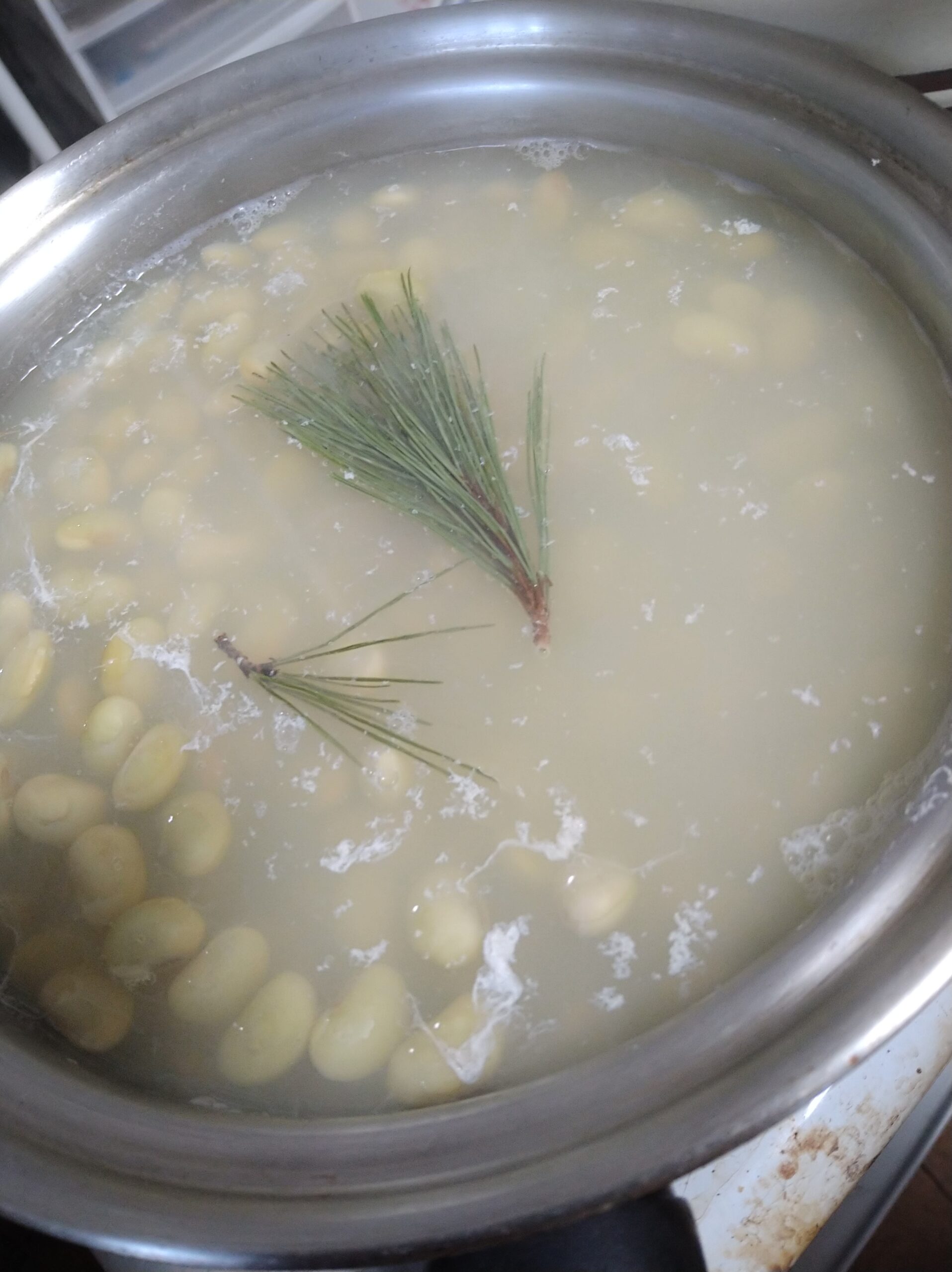 小豆や大豆などの豆類は下茹でします。そのときに、松葉を入れてみました。今回は秘伝豆という東北でしか見かけない豆です。主な産地は山形県になります。