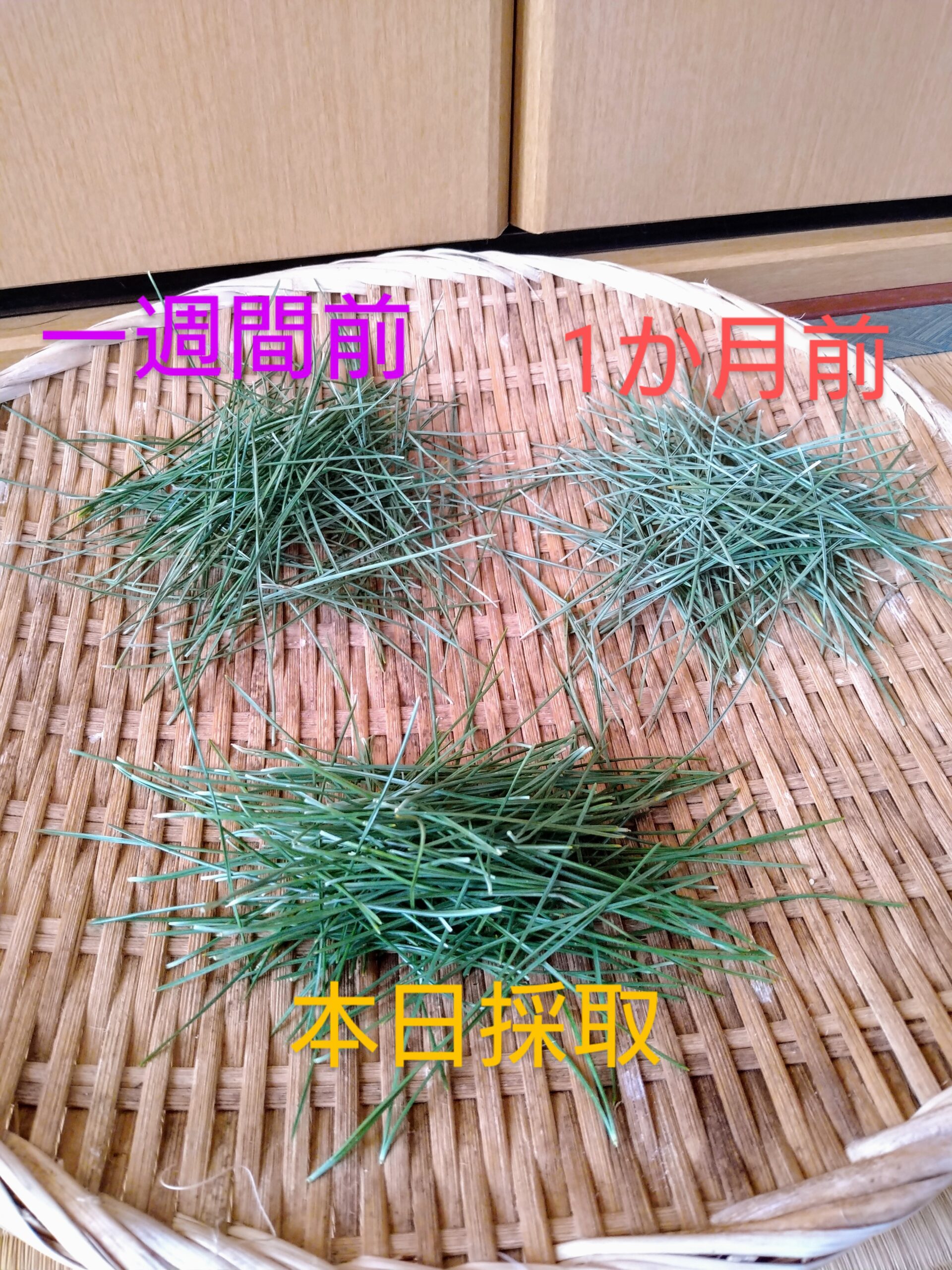 生野菜も買ったときは新鮮でも次第に萎びてきます。栄養もだんだんと減っていきます。松葉も生鮮食料品と同じで次第に萎びてくるし、栄養も減っていく、とわたしは考えているのです。