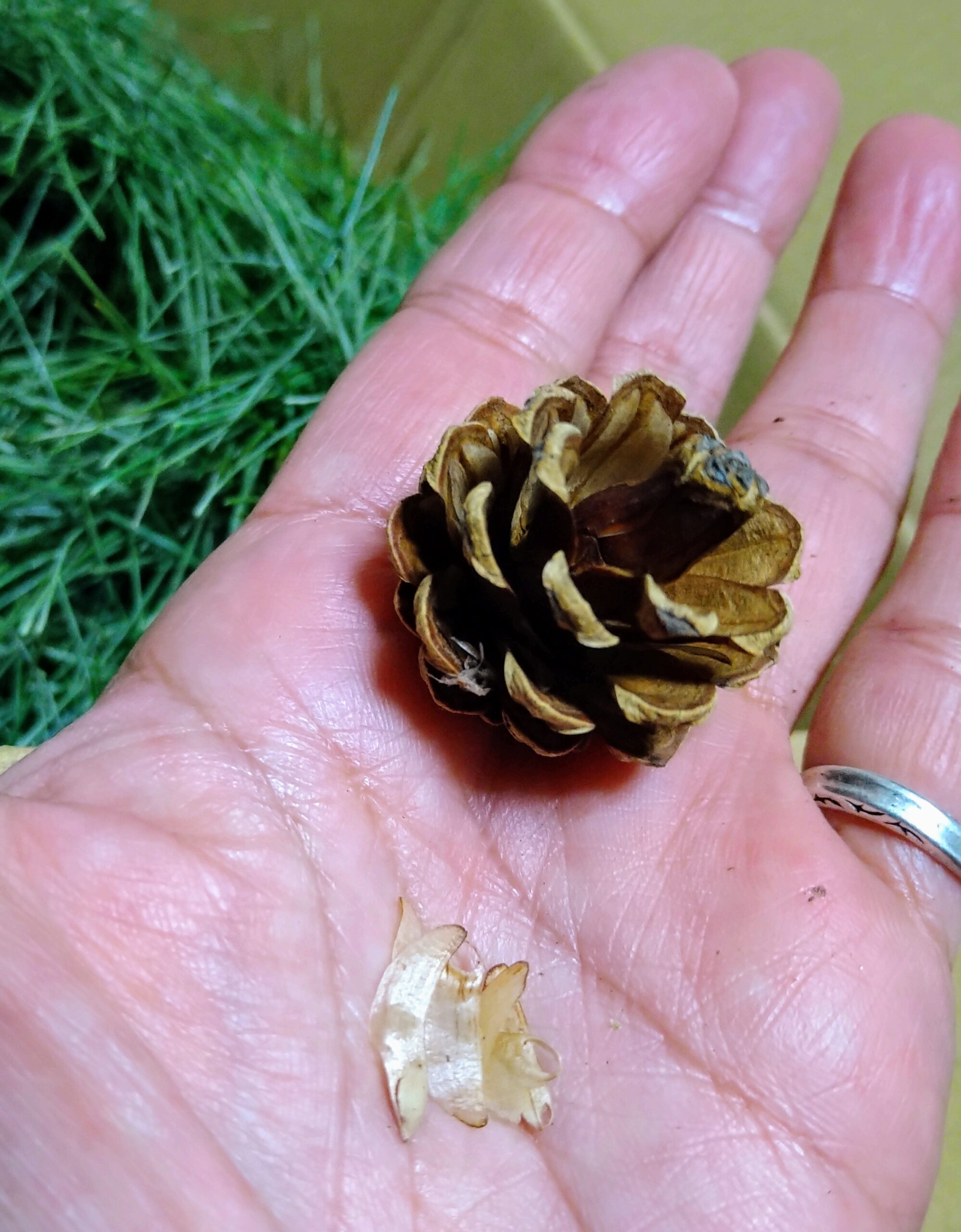 松ぼっくりの間から松の種を見つけました。この薄黄色い花びらのようなものの先っぽにある白い米粒のようなもの。それが松の種(松の実)です。松の実というと、韓国料理でよく使われます。赤松や黒松からは採取しにくいので、日本では松の実が流通しないのでしょう。松の実として売られているのは、チョウセン五葉松の松の種です。松の実については、「松の種子観光法と私の人生」という書籍に詳しく書かれています。