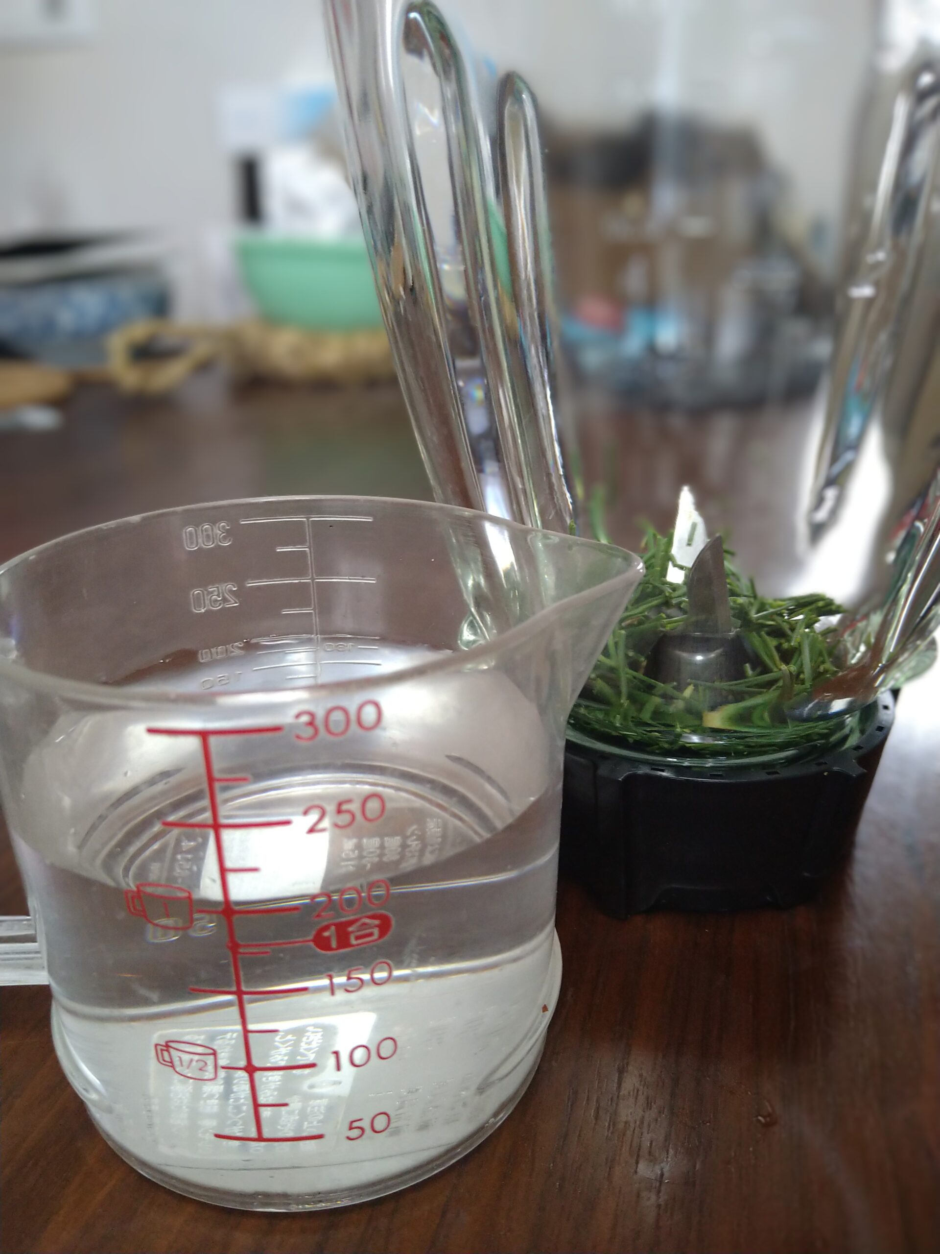 一掴みの松葉を包丁で切ります。細かいほうがミキサーを使う時間が短くなります。水は200㏄を松葉と共にミキサーに入れます。