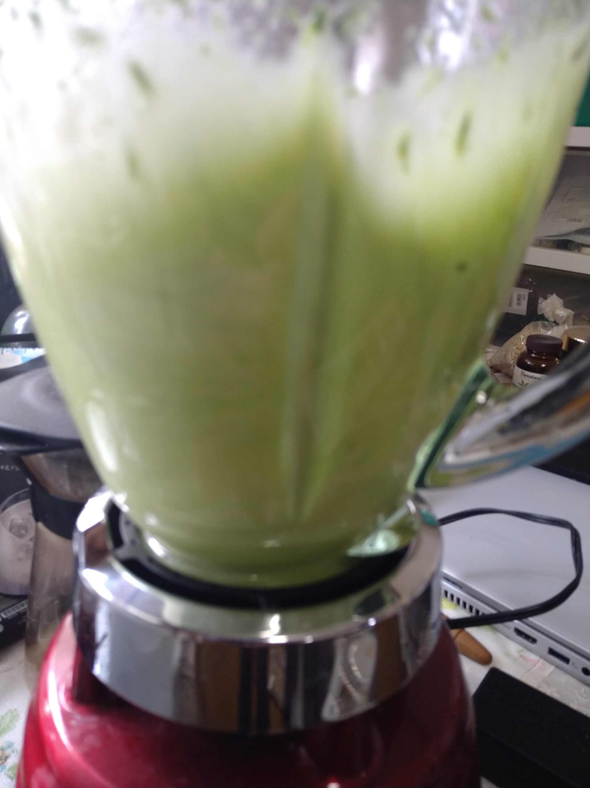 ミキサーにかけます。だんだんと液体が緑になってきます。