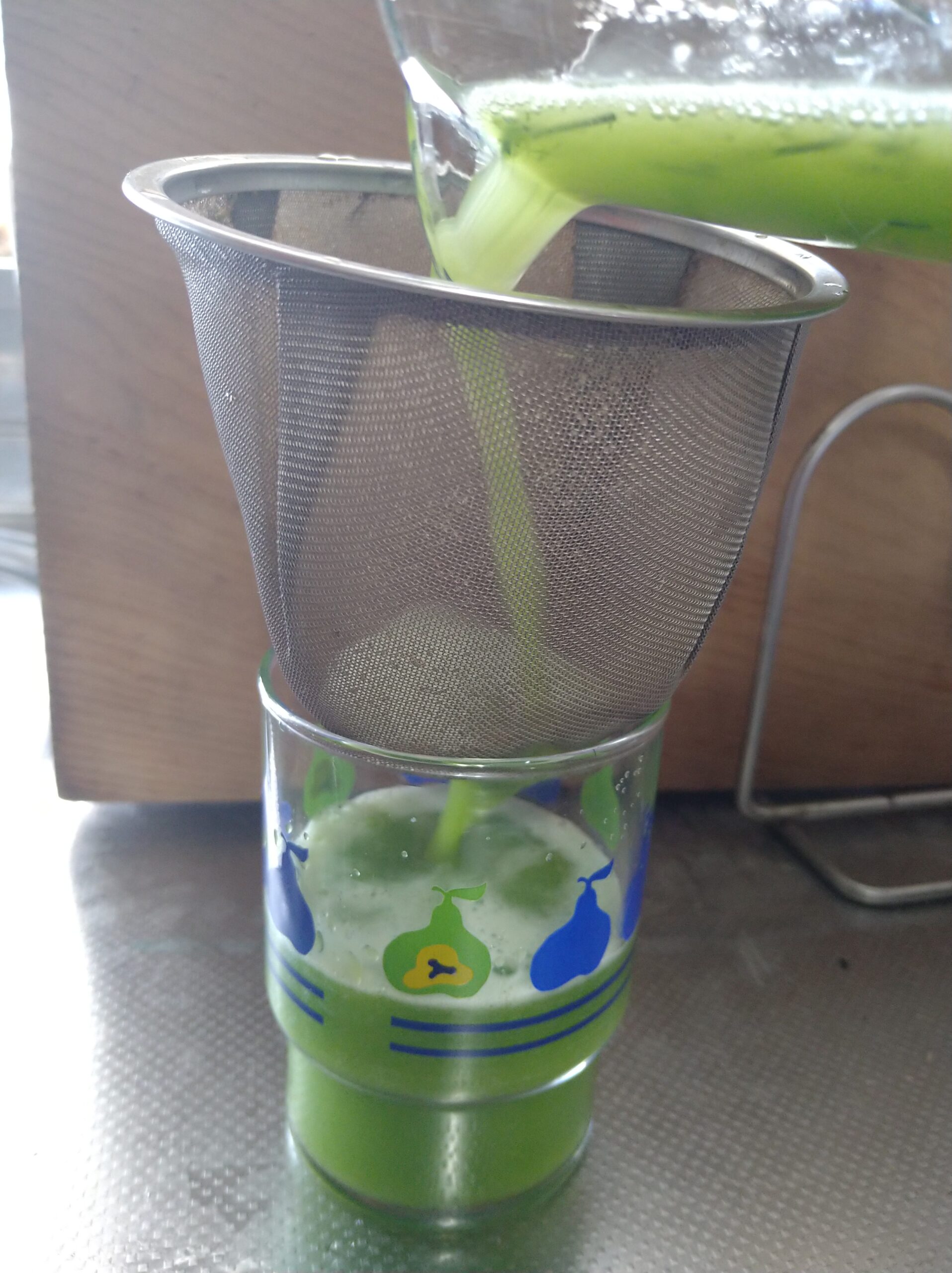 茶こしで松葉を濾したら完成です。つわものはそのまま漉さないで飲むみたいです。しかし、喉がチクチクするので、最初は飲みやすい状態にするのをおススメします。この濾したものも活用できますので、ご安心を!