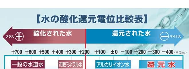 こちらはFacebookの投稿よりお借りした図です。一般的な水道水は酸化された水で+500~+700という数値です。そして、市販のミネラル水でも酸化された水+200~+350くらい。還元されているというのは、マイナスの水でアルカリイオン水で+100~-100と言われています。そして「-200よりマイナスの多いもの」を還元水と呼んでいます。