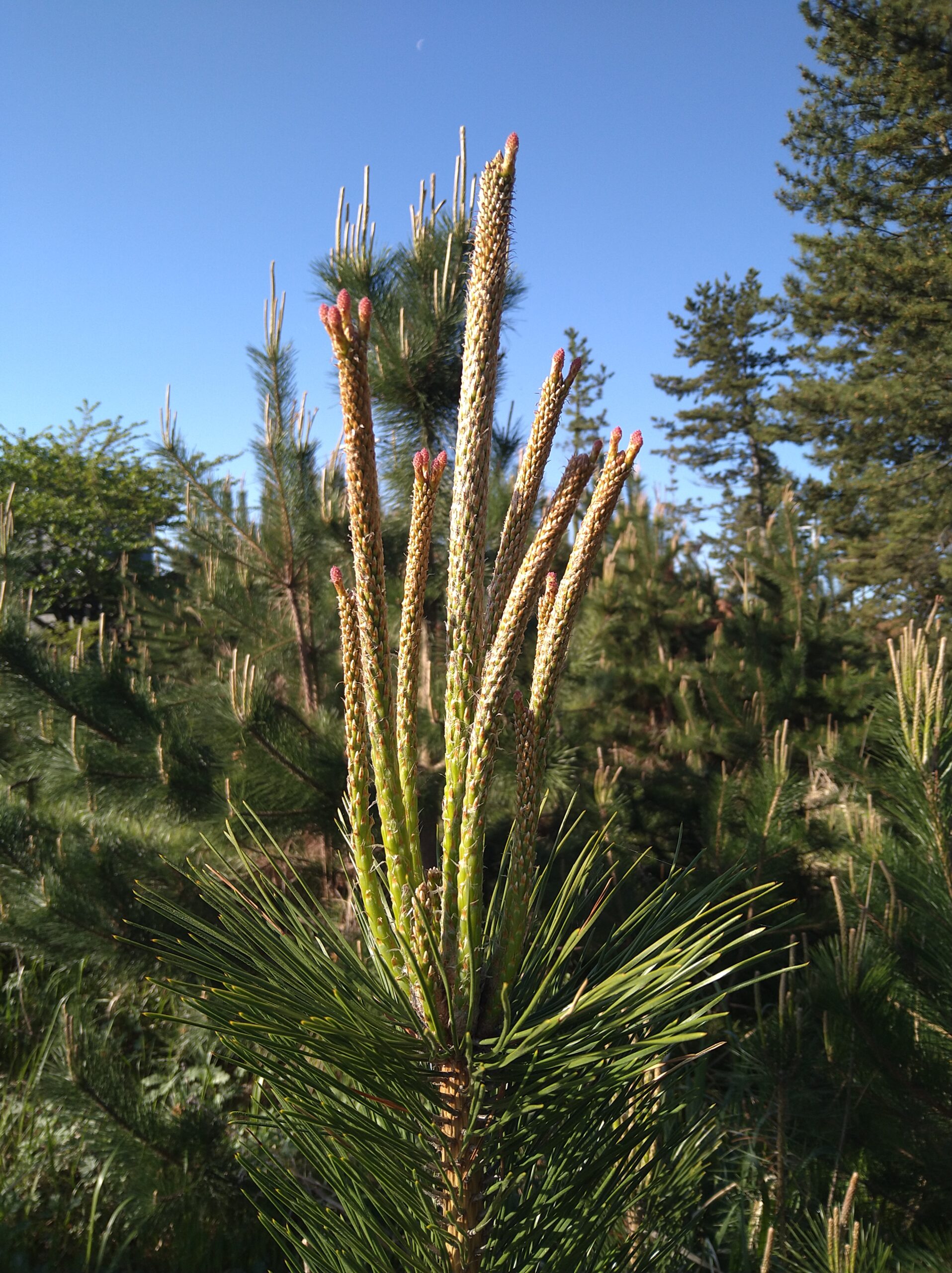 ミドリの先の赤いぷっくりとした部分。これが雌の花です。雄花が撒いた花粉を雌花が受粉します。その後大きくなり松ぼっくり(マツカサ)へと成長していきます。