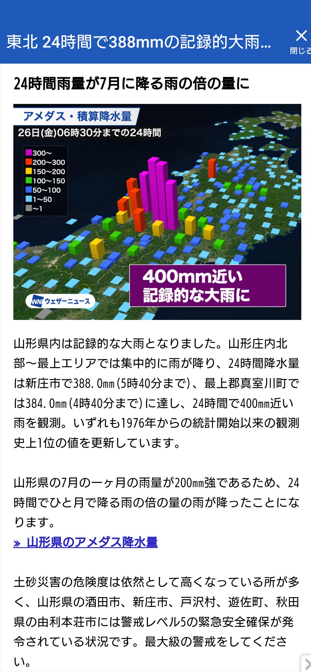 国土の半分くらいが梅雨明けした日本列島。しかし、ここ山形庄内地方はまだ梅雨明けしていません。そして、先日は集中的に大雨が降りました!(2024.5.26.ウェザーニュースのスクリーンショットです)