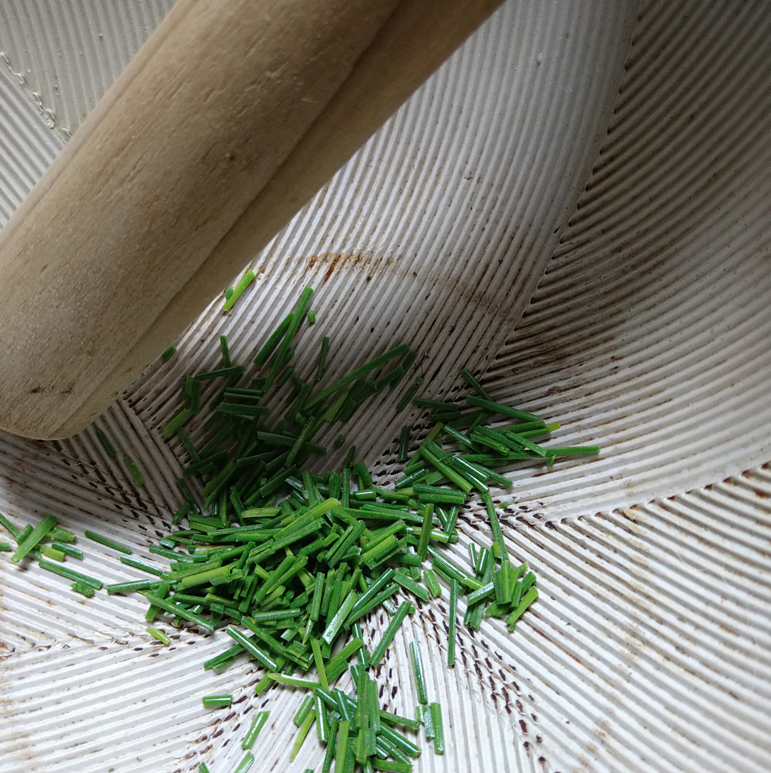 松葉をすりつぶして、酢を入れる。それを度々塗ることで、打ち身に効果がある。それを信じて、早速作ってみることにしました。