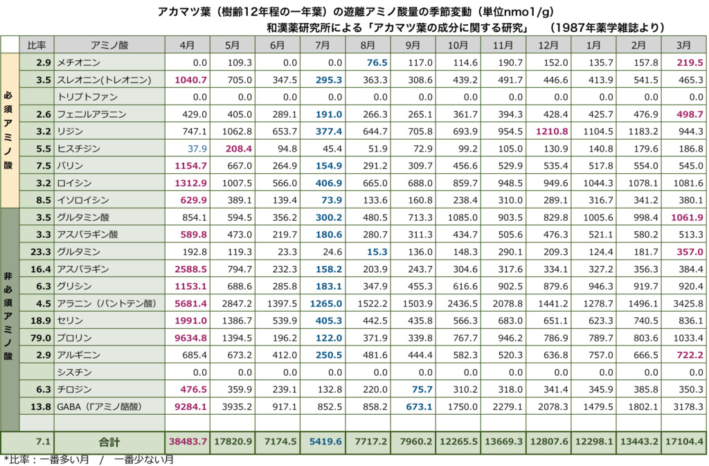 こちらの表は赤松のアミノ酸の変動を表したものです。赤い文字がアミノ酸が多い月です。だいたいが3~4月に集中していることが分かります。