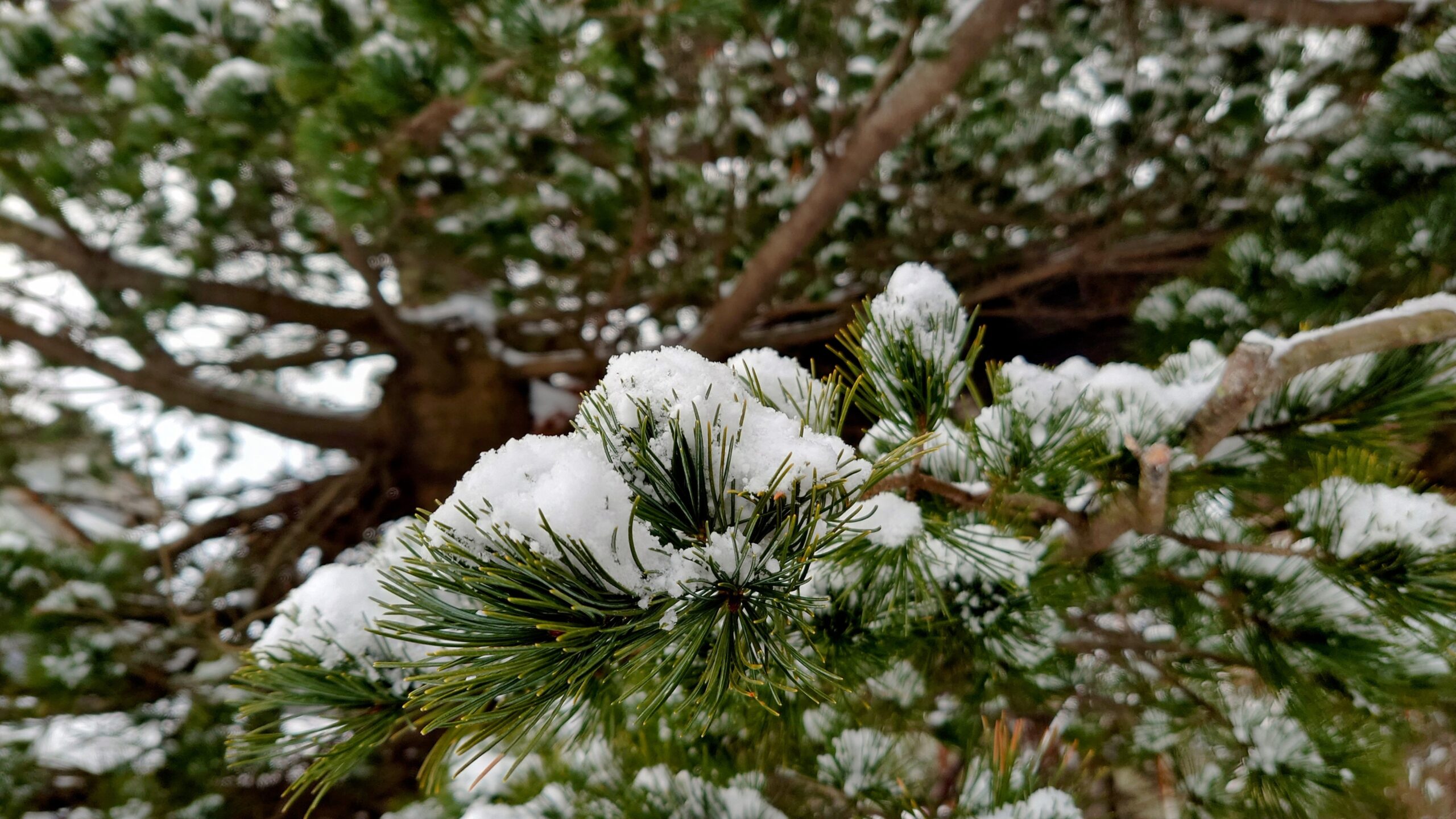 近くの松の若木は雪をうっすらと纏って。