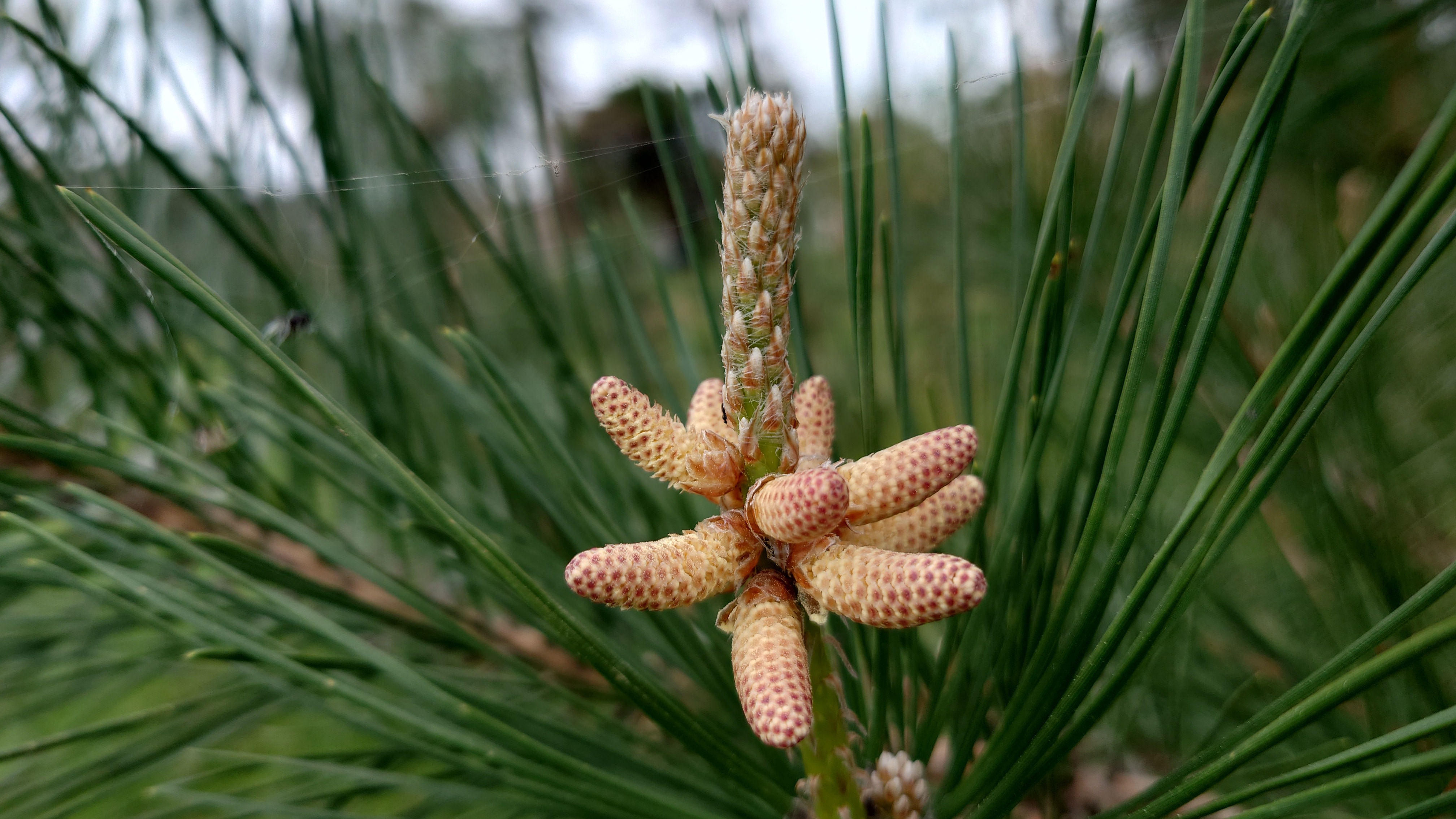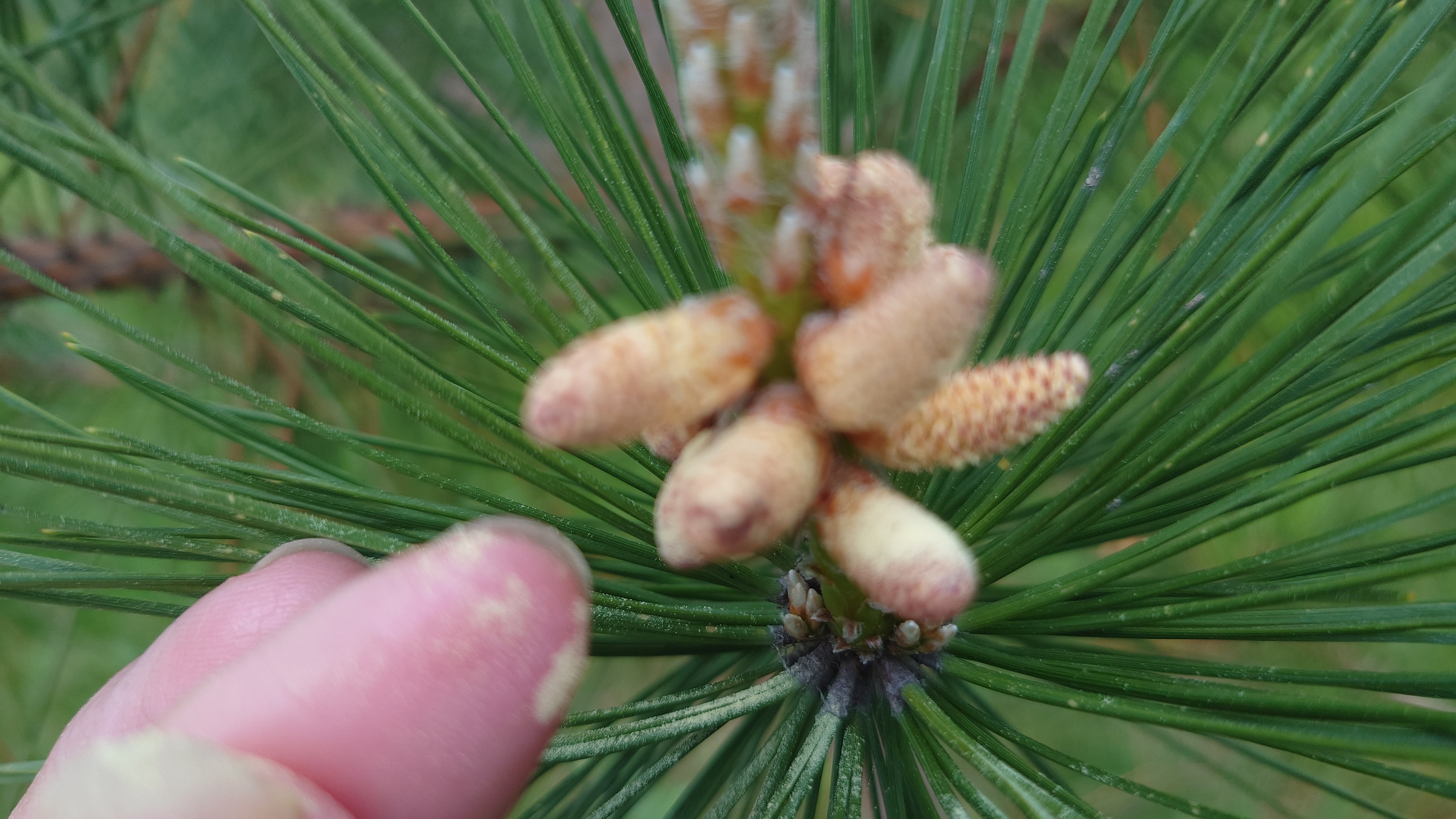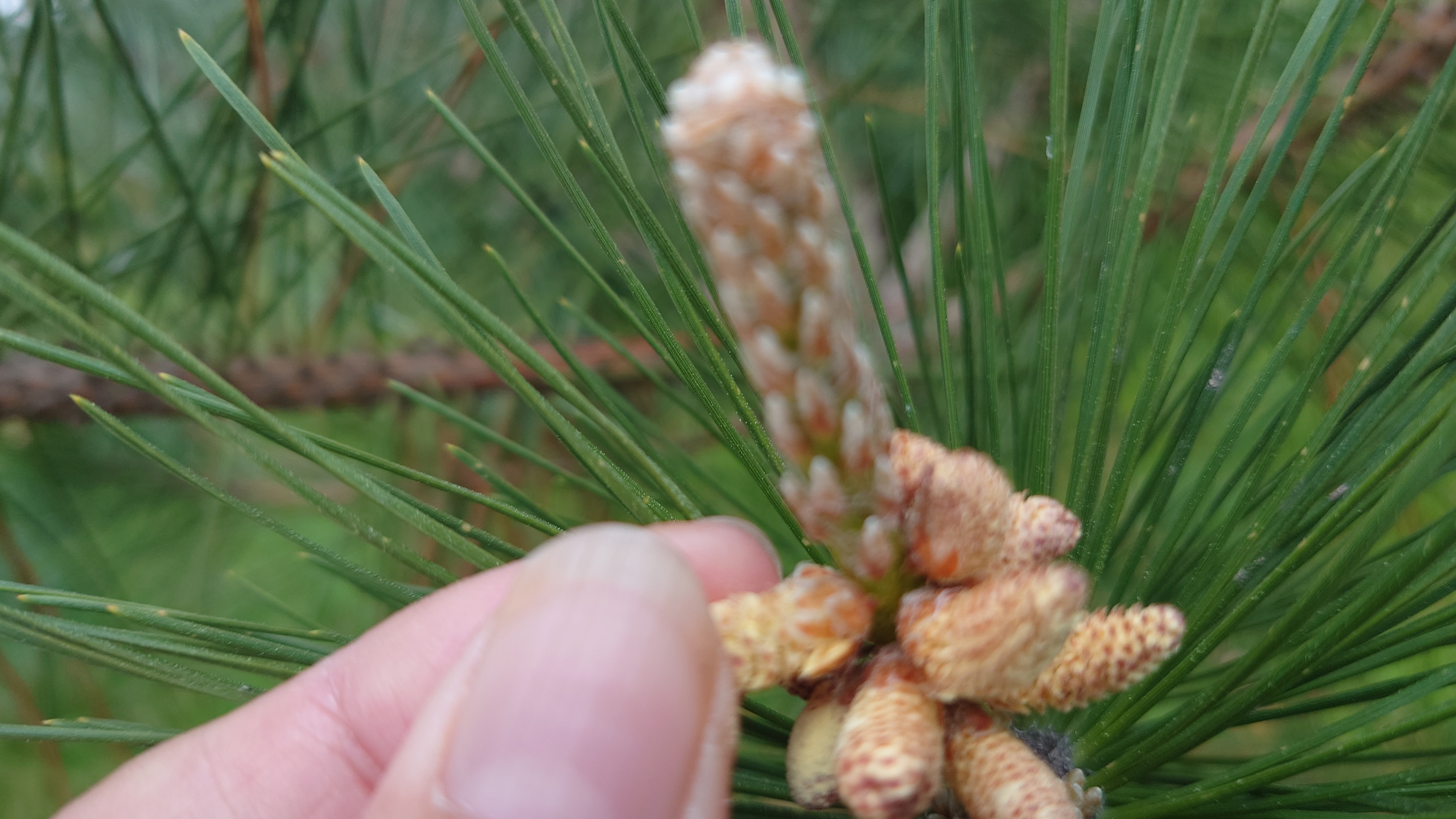 松の若木がたくさんの緑を伸ばします。その中で一部の松の木に花粉が出来ていました。一方、成熟した松の木は緑が短く花粉を大量に放ちます。手で触ると黄色い粉が出てきます。