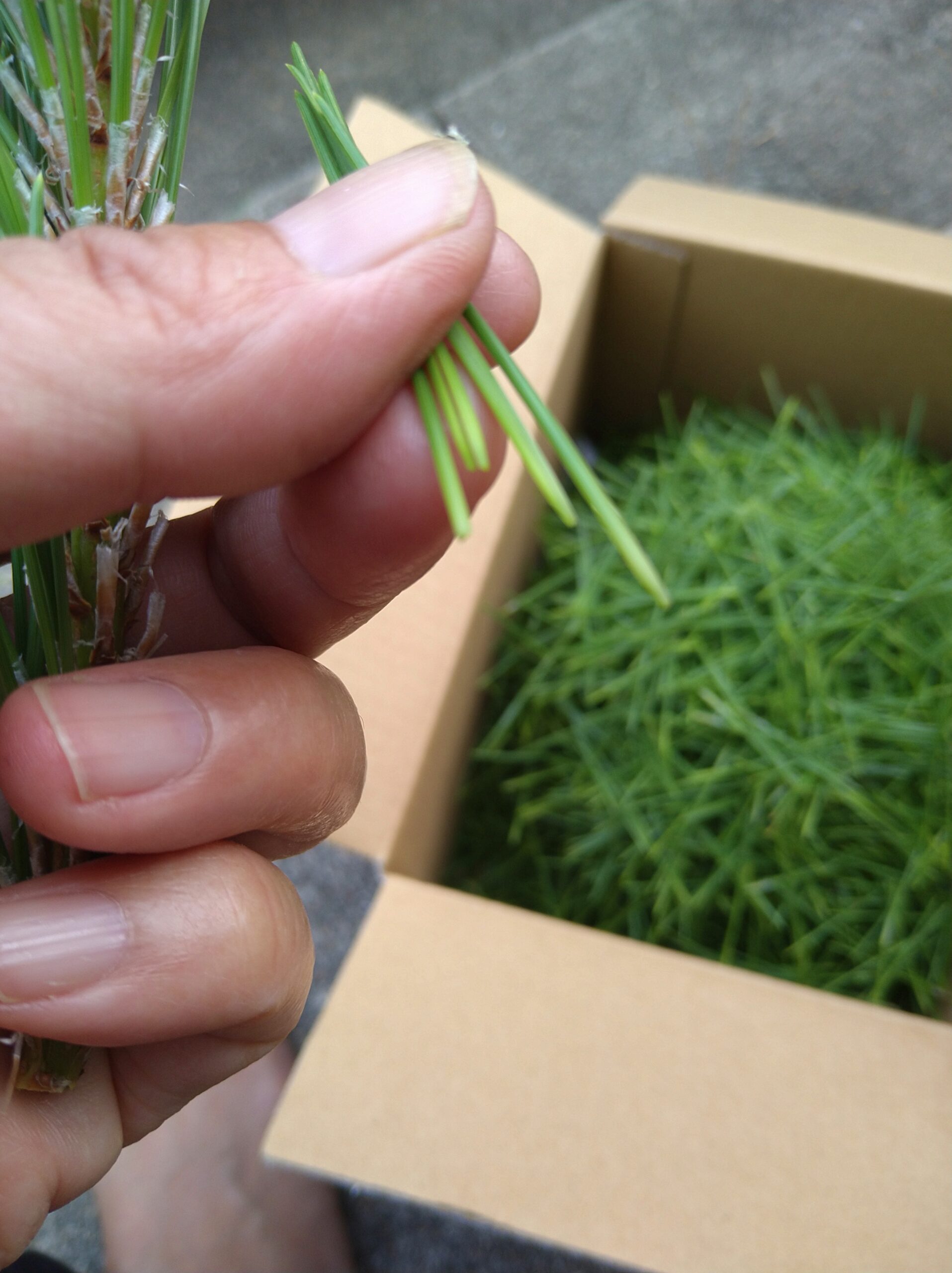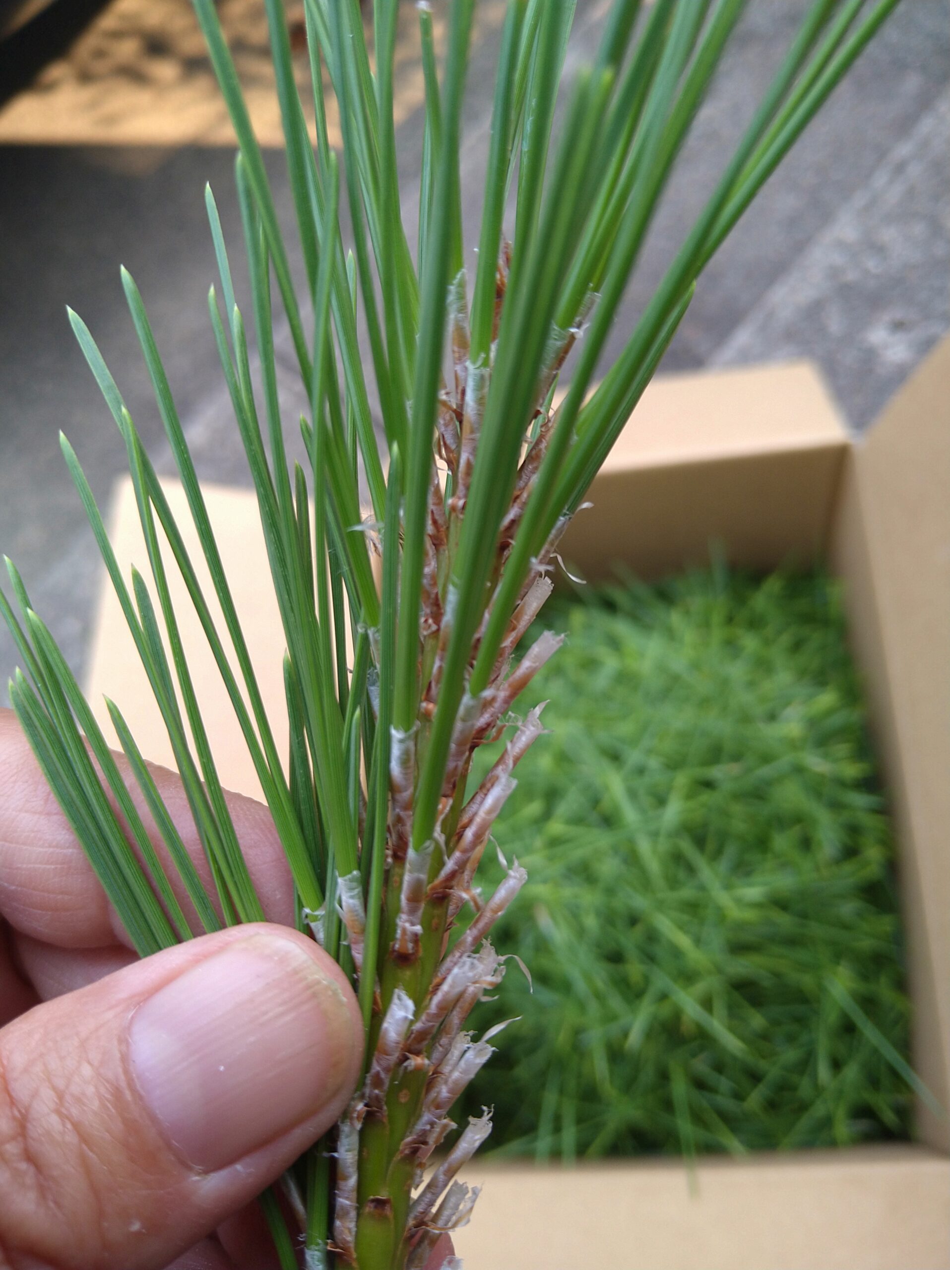 若葉を採取していると、する、するっと松葉が採れます。普段なら葉にくっついてくる袴がそのまま枝の部分に残っていきます。