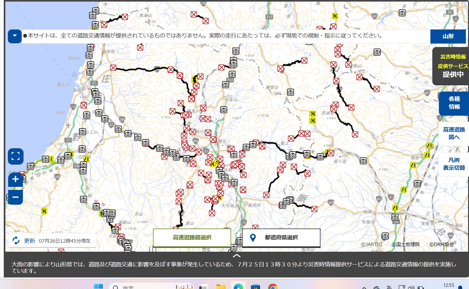 現在はこのような感じで山形県内あちこちで通行止めとなっております。配送ドライバーの皆さま、物流関係の方々は大変な思いをされていらっしゃることでしょう。本当に頭が下がります。