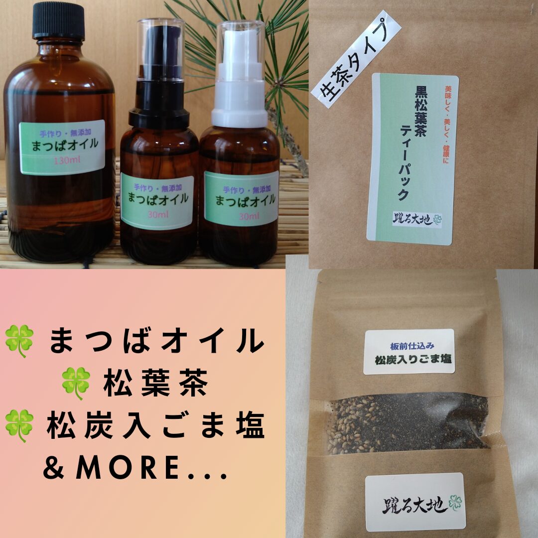 【躍る大地】は、松葉オイルをメインとして他、松葉関連商品を製造・販売しています。メインの「九鬼太白ごま油」を使った松葉オイルは、テンペル、ケセルチン、α-ピネン、ビタミン類(VA,VC)など成分がたっぷり。日常使いとしてはもちろん、プレゼントとしてもおすすめです。「やりたいことをとことんやれる」心と身体を育みませんか?