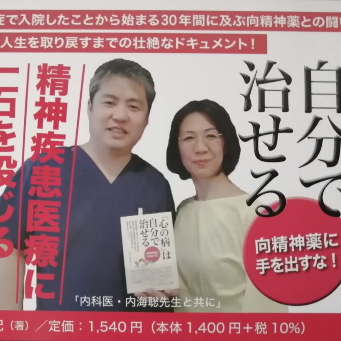 出版当時書店に置いていただくのに、作成したPOPです。推薦文を内科医の内海聡氏に書いていただきました。精神病は自ら止めることが出来る。断薬の指導をしている内海先生に推薦していただけたのは、なにより光栄です。