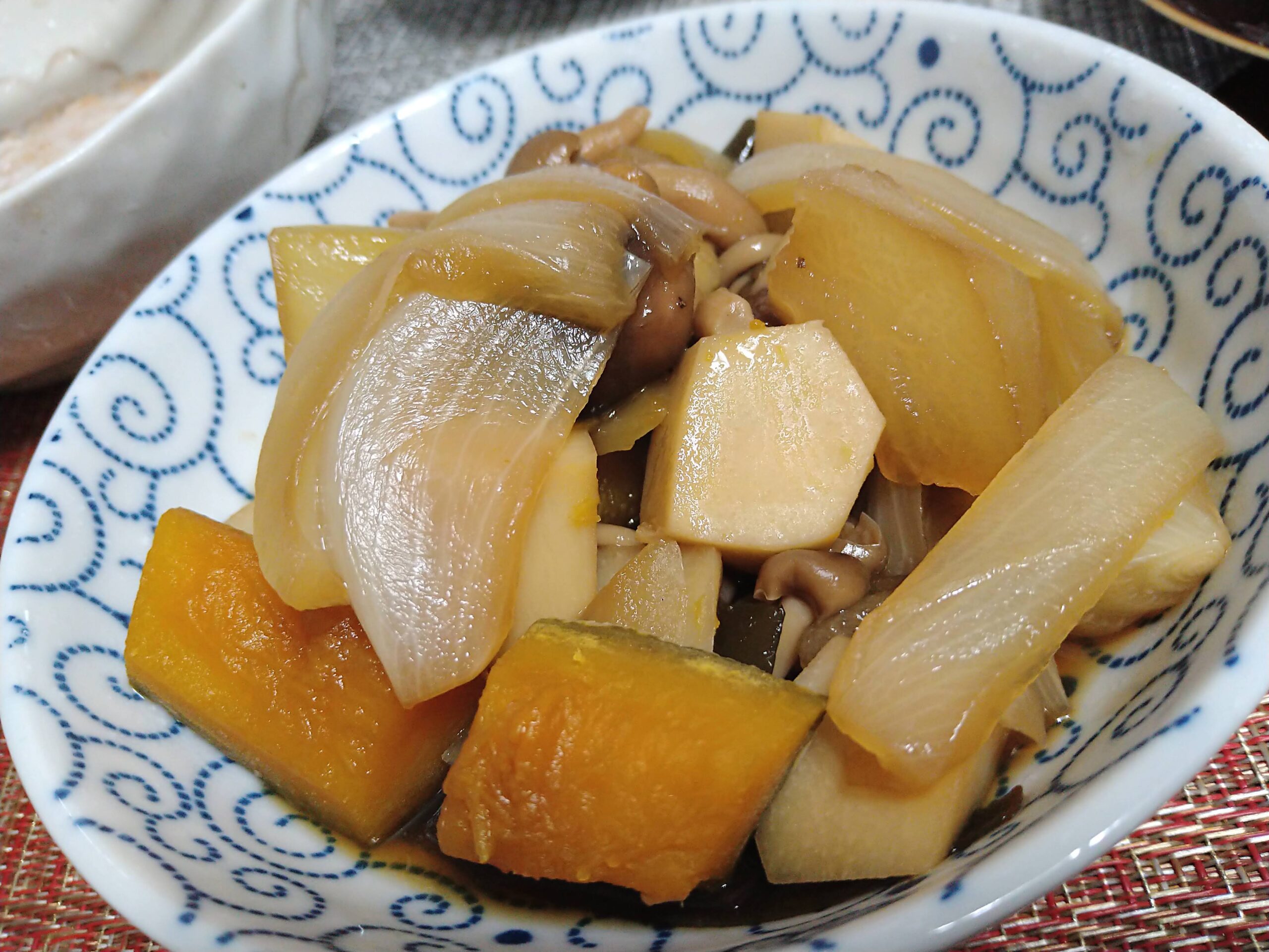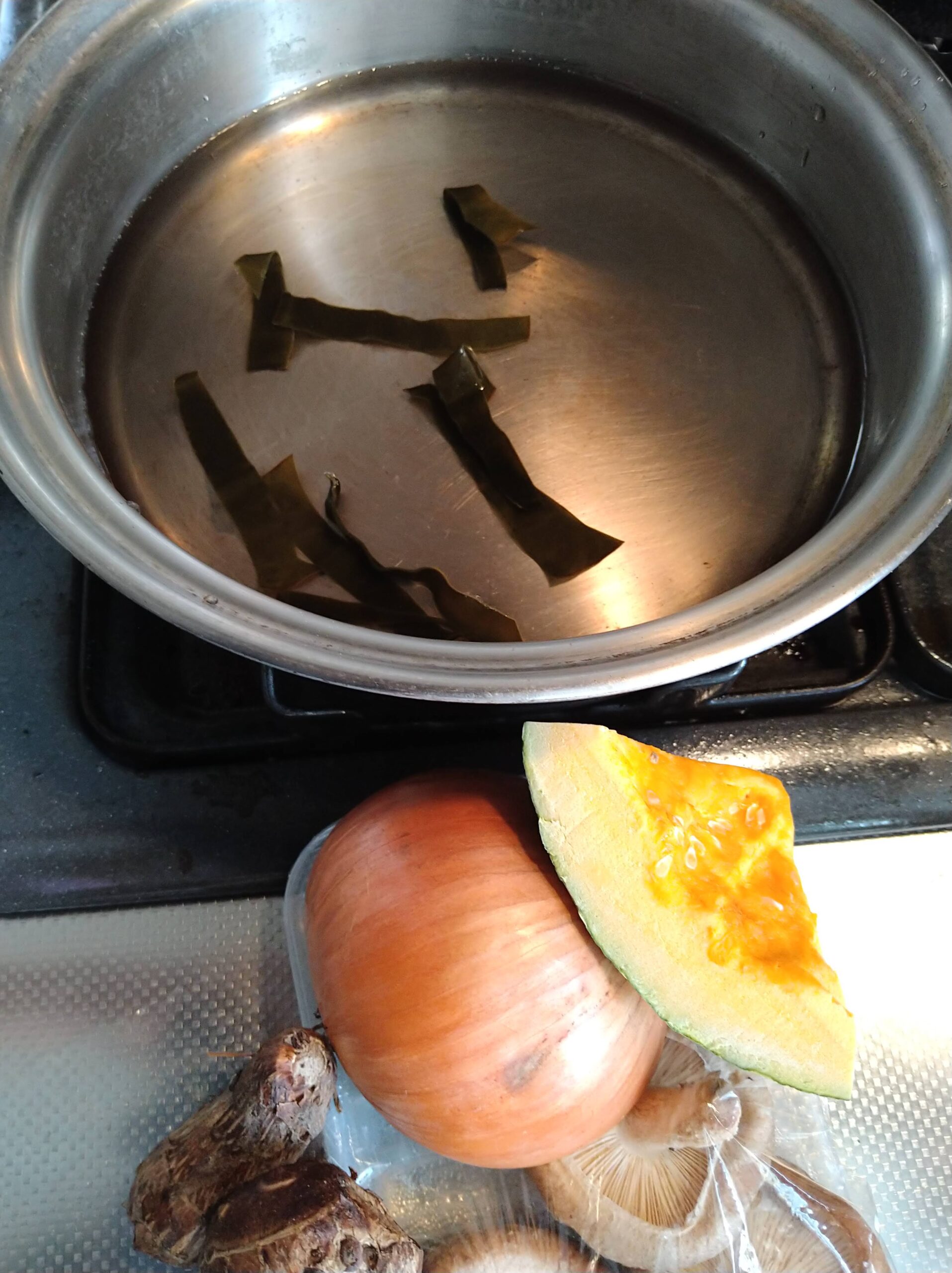 食材は、家にあったもの……玉ねぎ・かぼちゃ・里芋・シイタケです。